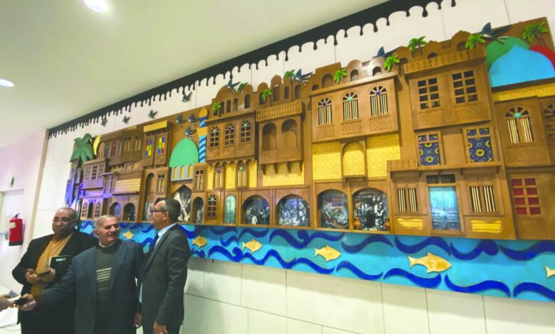 كما زيّنت الجدارية بصور فوتوغرافية حقيقية لمحلات الحلة القديمة، أُدمجت بعناية داخل العمل الفني.