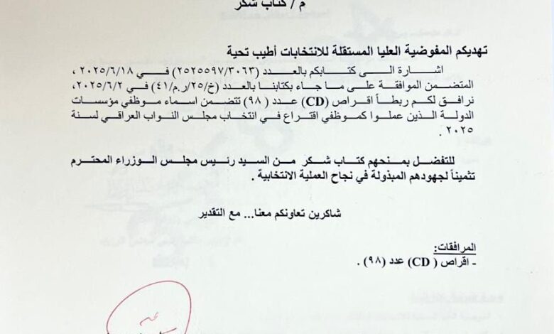 أعربت المفوضية العليا المستقلة للانتخابات عن تقديرها للجهود الاستثنائية التي بذلها موظفي اقتراع اليوم الواحد من منتسبي مؤسسات ووزارات الدولة كافة الذين شاركوا في إدارة وإنجاح عملية انتخاب مجلس النواب العراقي لعام 2025.